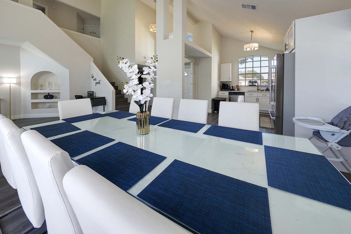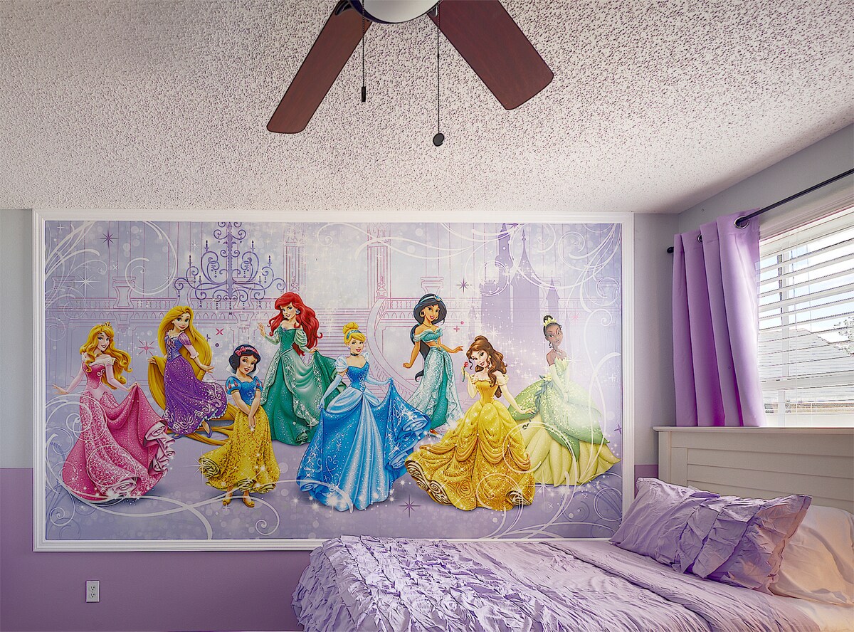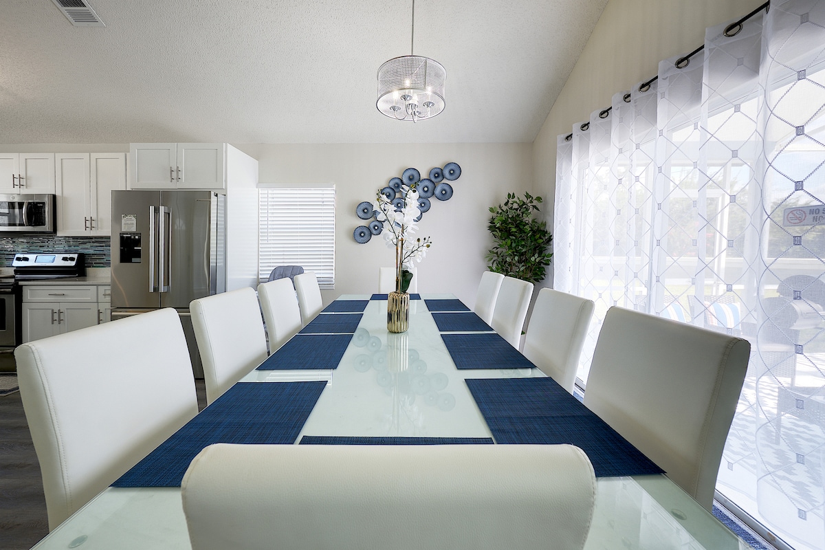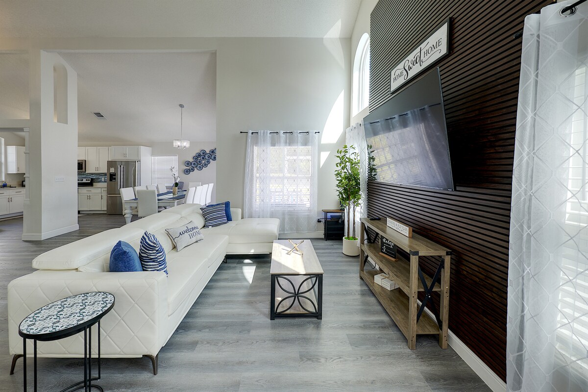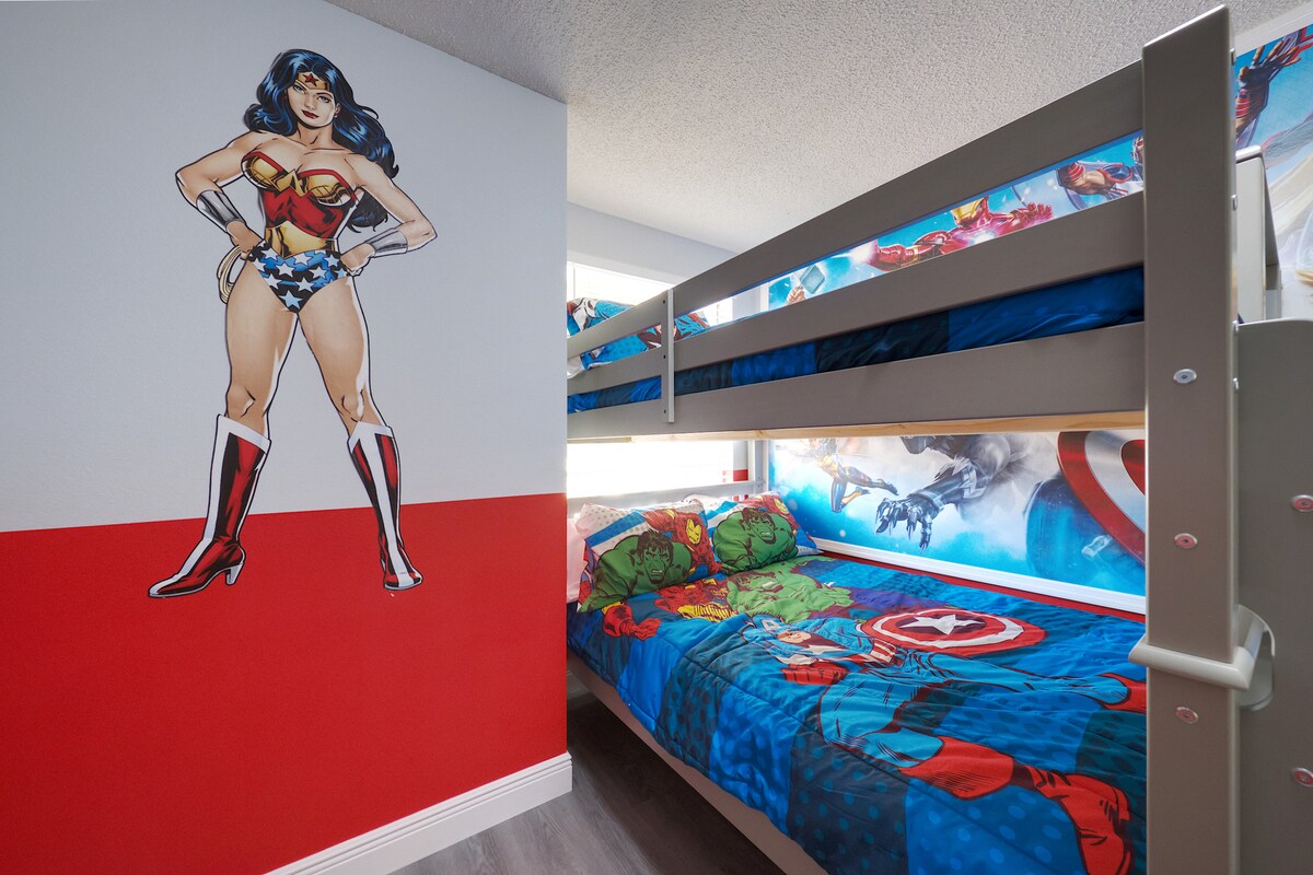 Experience the ultimate family-friendly vacation at our fully renovated spacious home, conveniently located just 13 minutes from Disney World. Boasting four themed bedrooms, themed game-room, 2.5 bathrooms, private heated pool, office space and fully stocked kitchen. This retreat is perfect for both large families and business travelers alike.